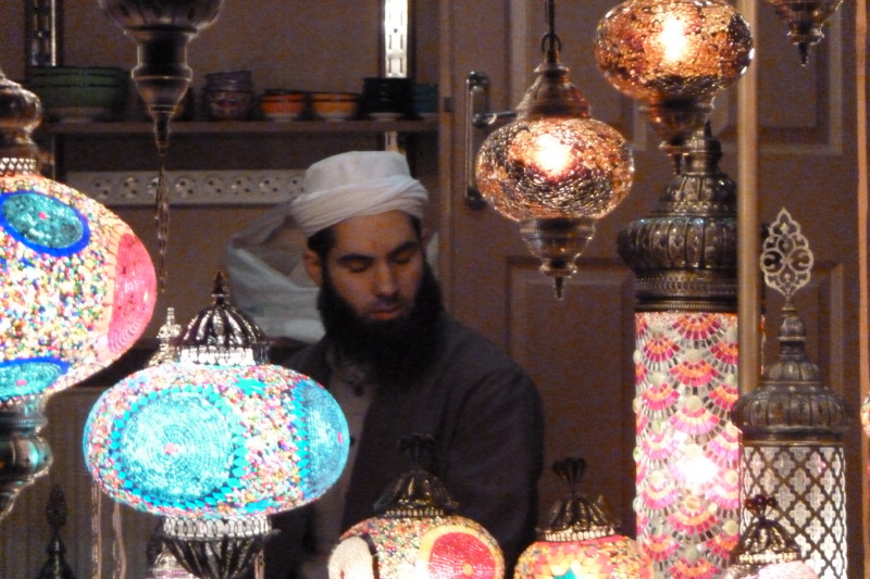 Yksinäinen mies rukoilemassa lamppukaupassa