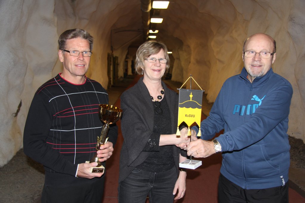 Vaihdon symboliksi KuSVun puheenjohtaja Vilho ”Ville” Laakkonen luovutti RRR:lle laatikollisen palkintopokaaleja sekä menestyksekkään seuran kunniaviirin.